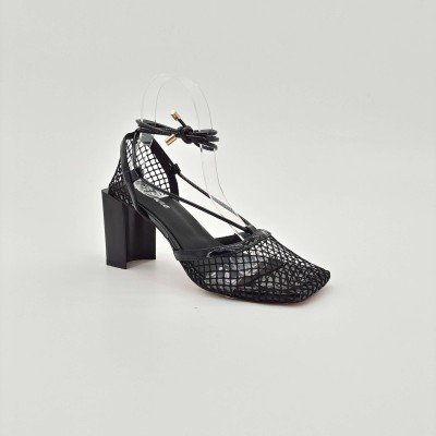 All black mesh high heels, black strap with gold metal buckle, comfortable curved forefoot design