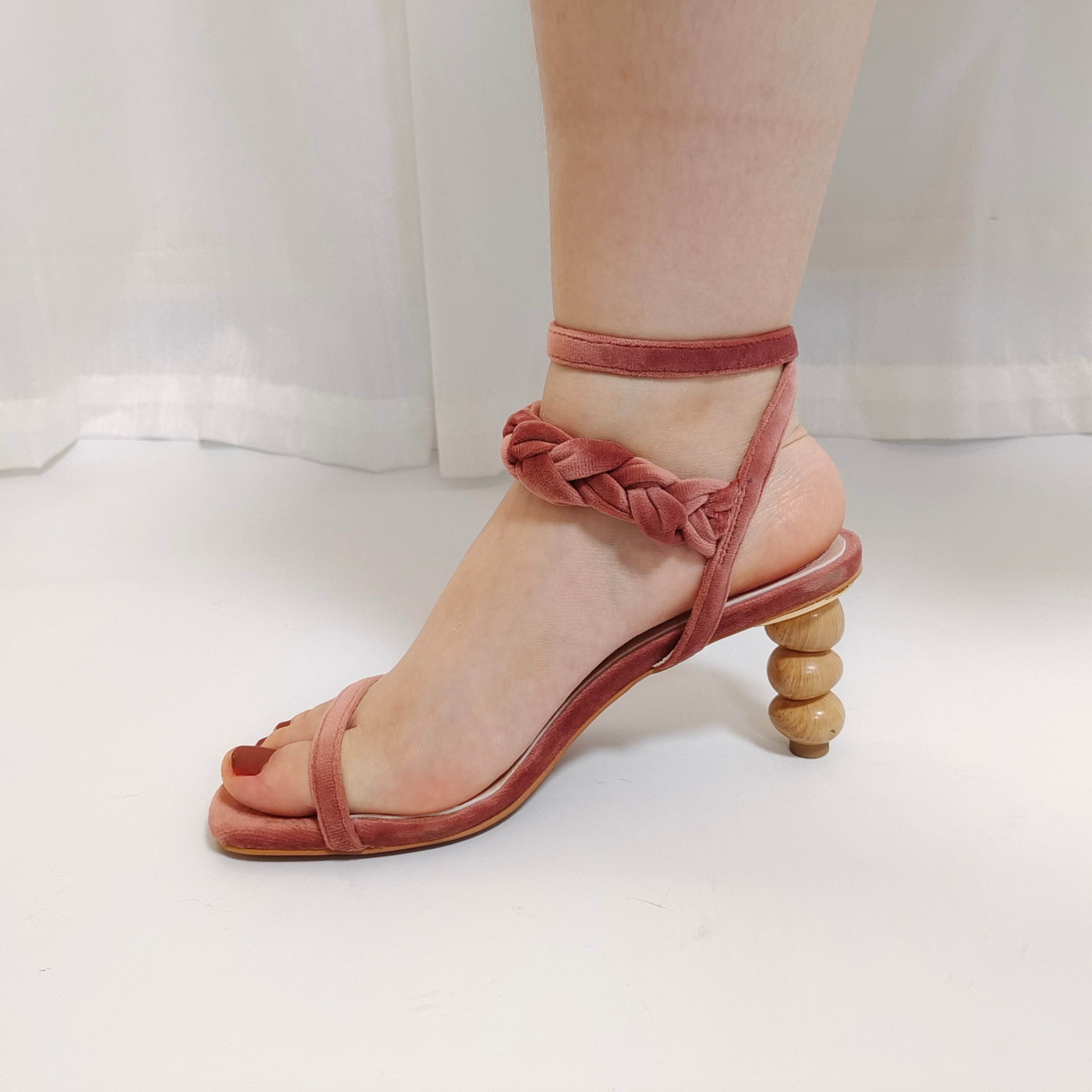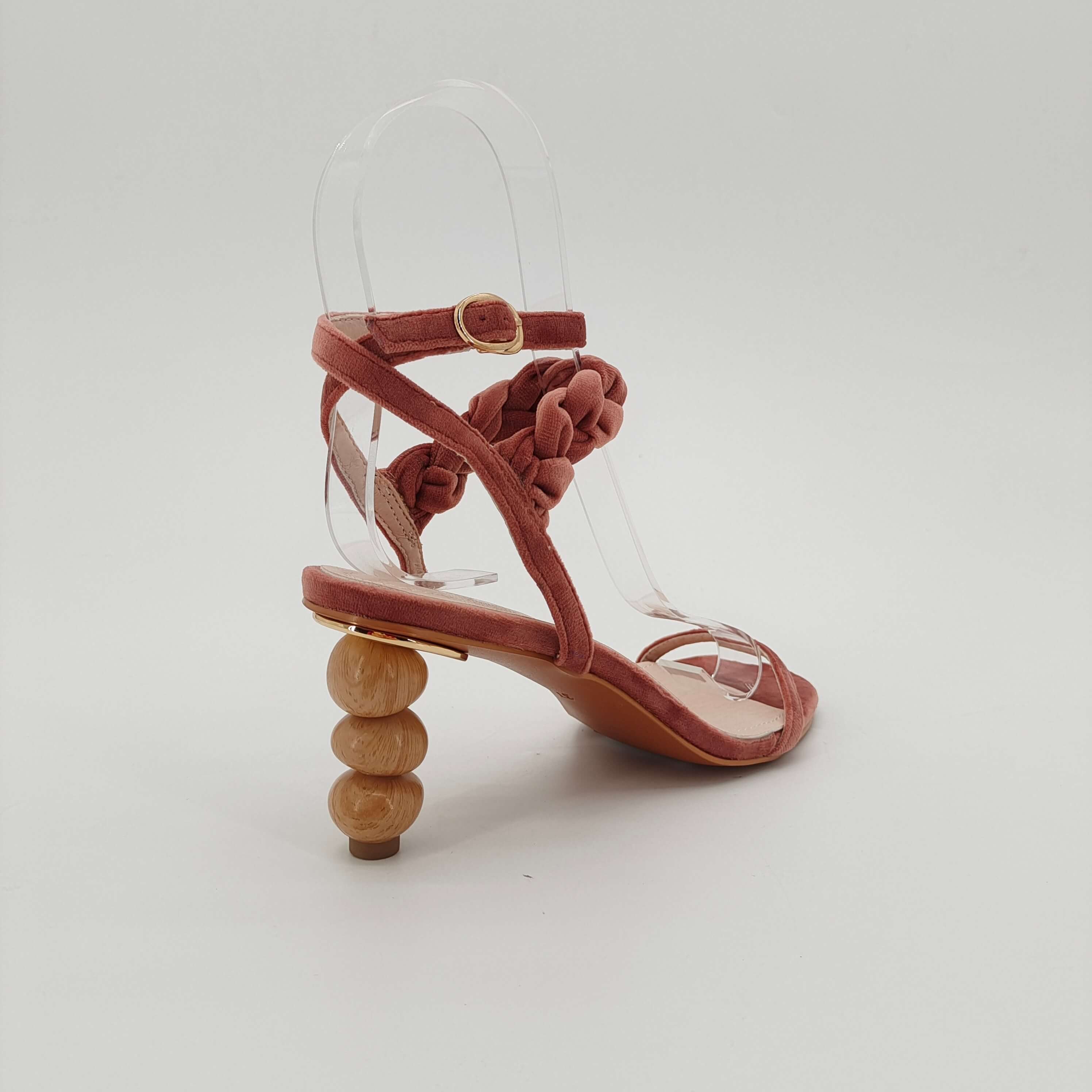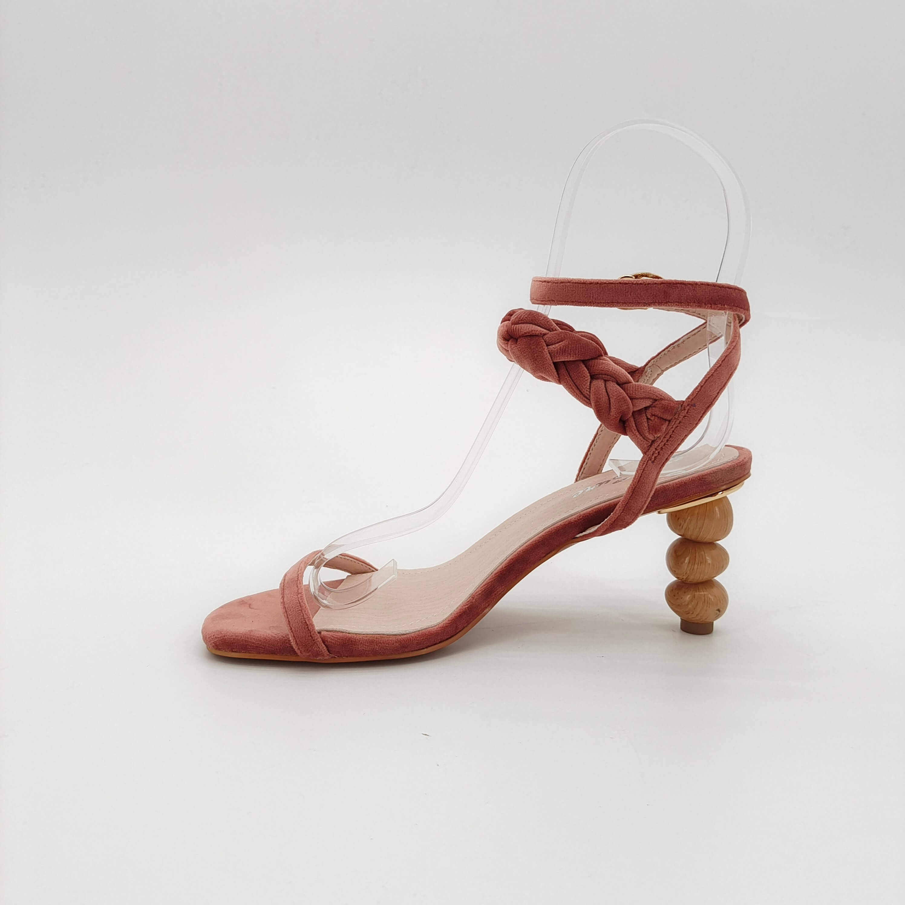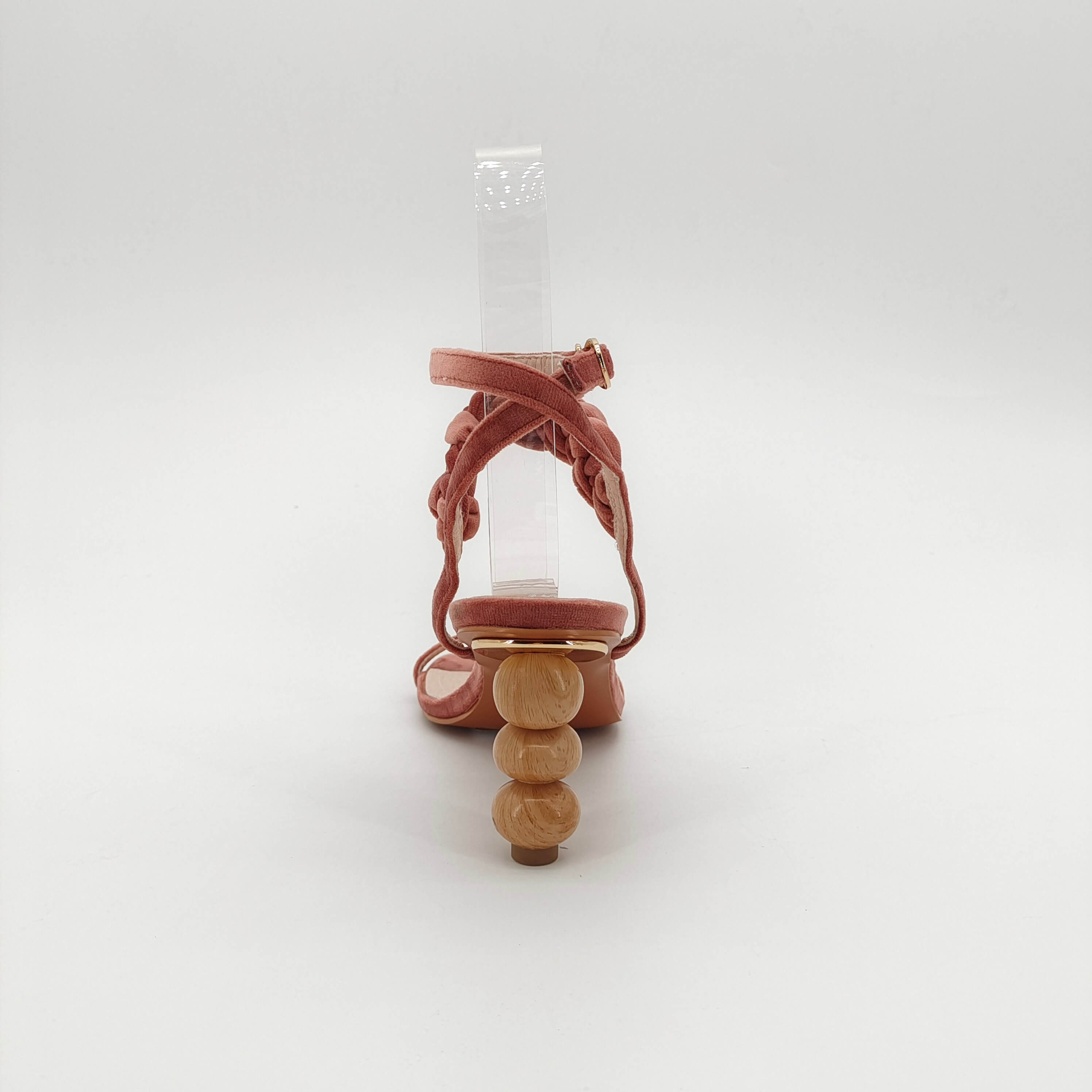 Pink High Heels, Light Brown Wood Bottom, Metal Buckle, Elegant Design for Women's Shoes