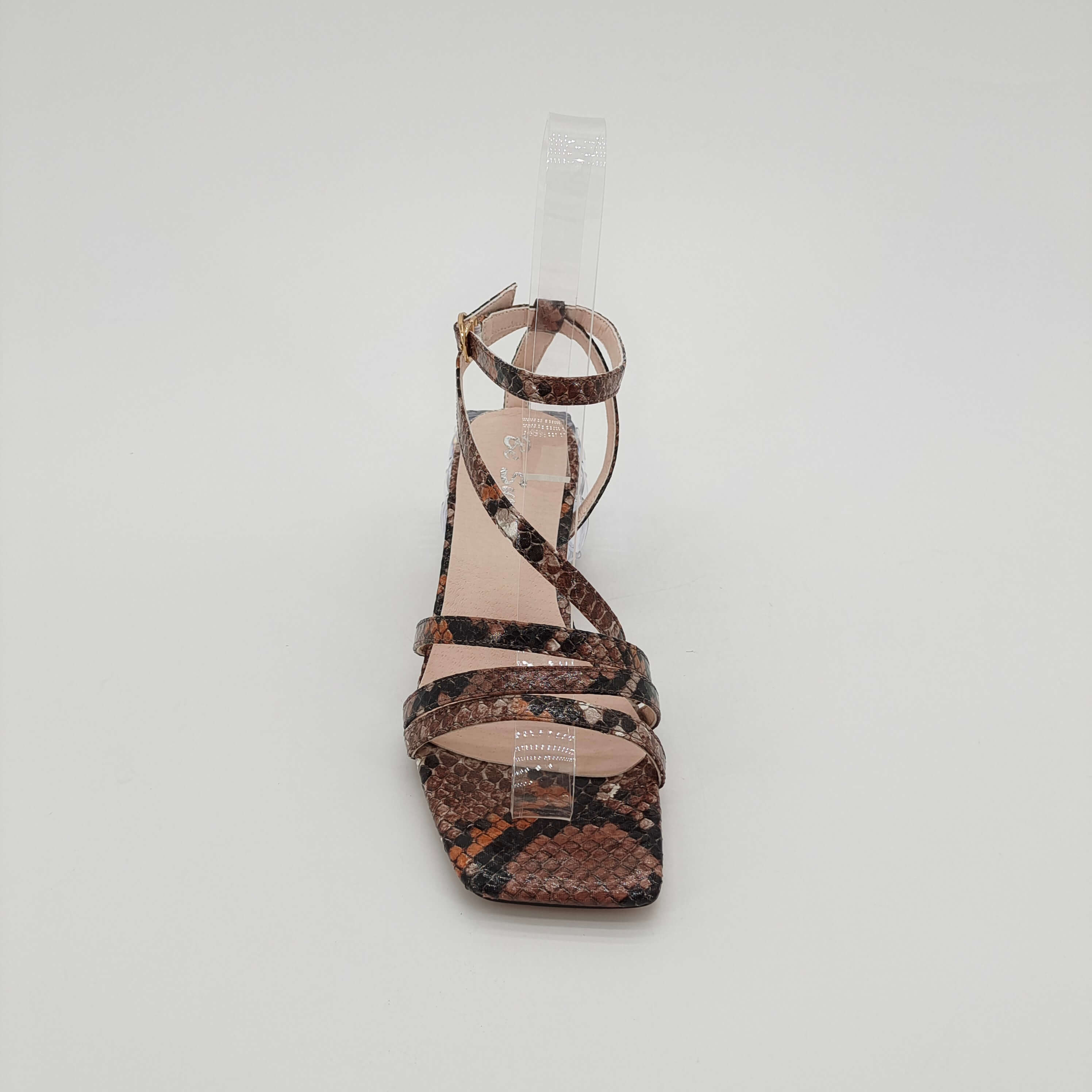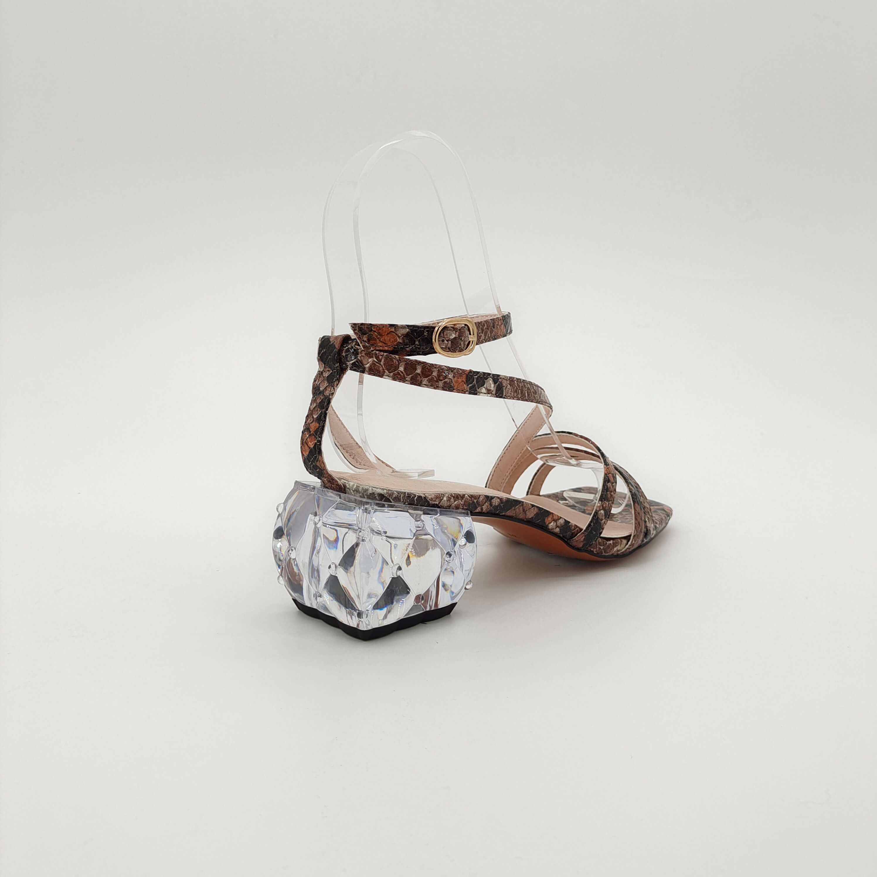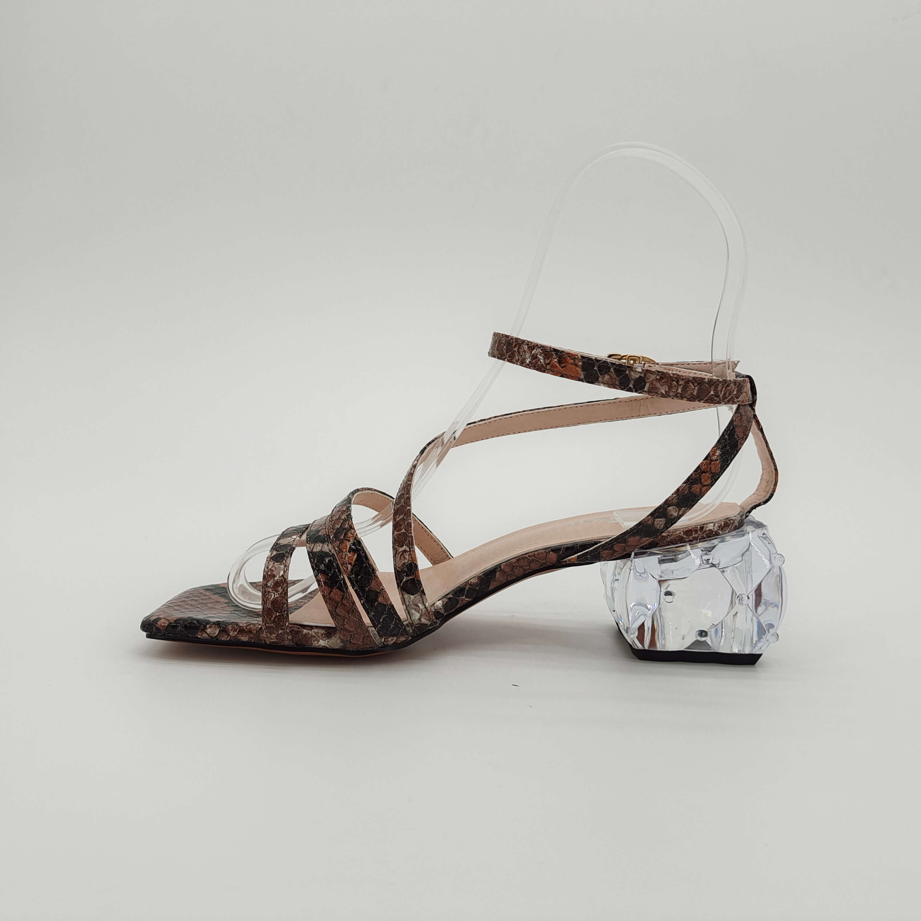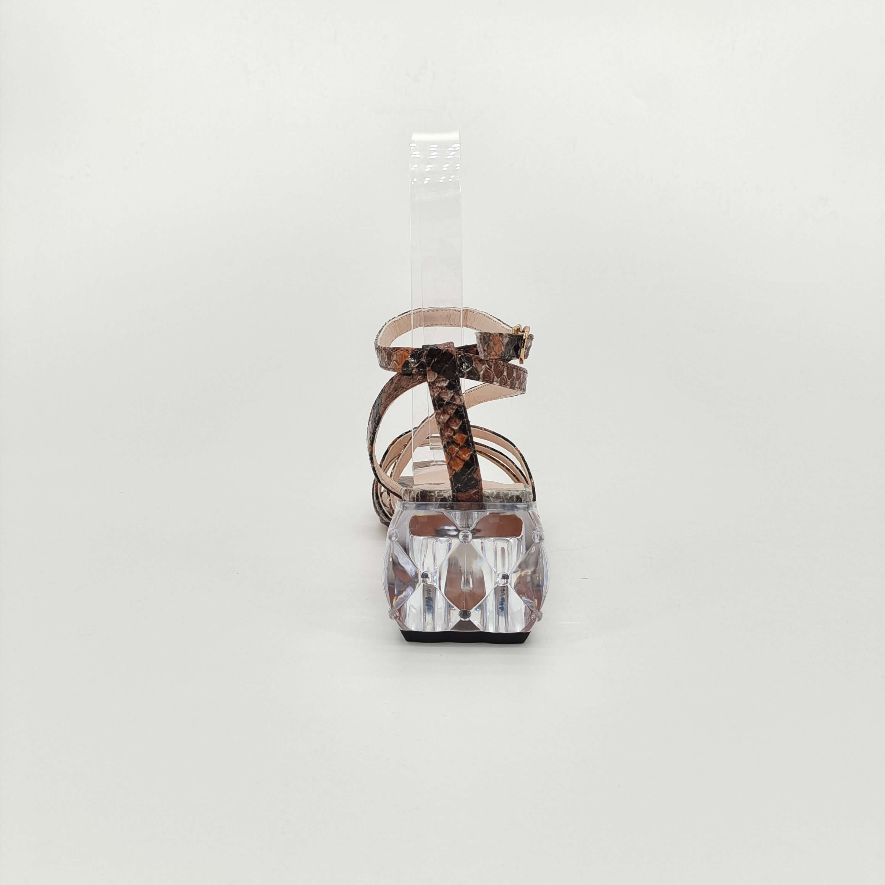 [Luxury Fashion] Brown Black Snake Skin Pattern High Heel Sandals Transparent Crystal Base Cross Strap Ankle Buckle Design