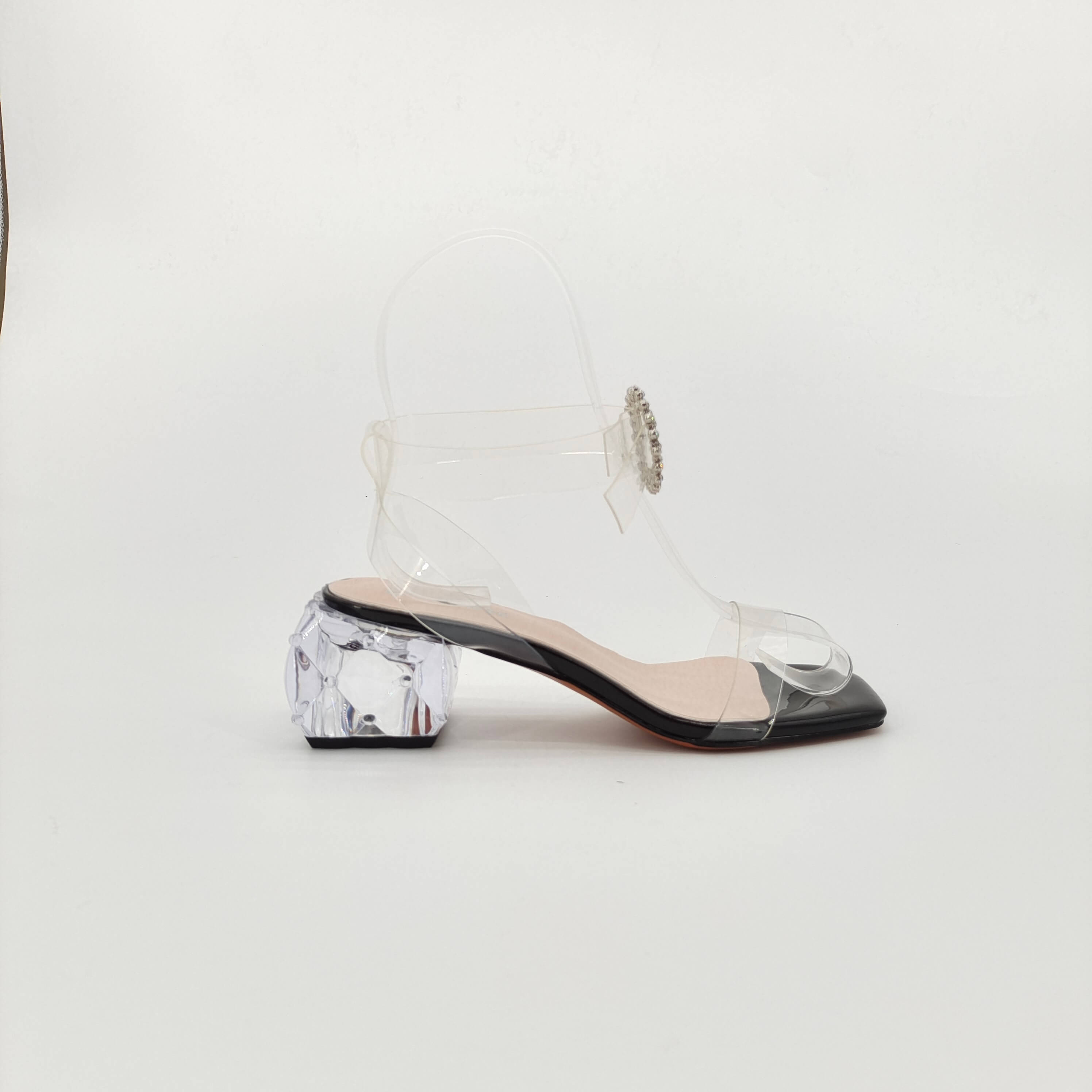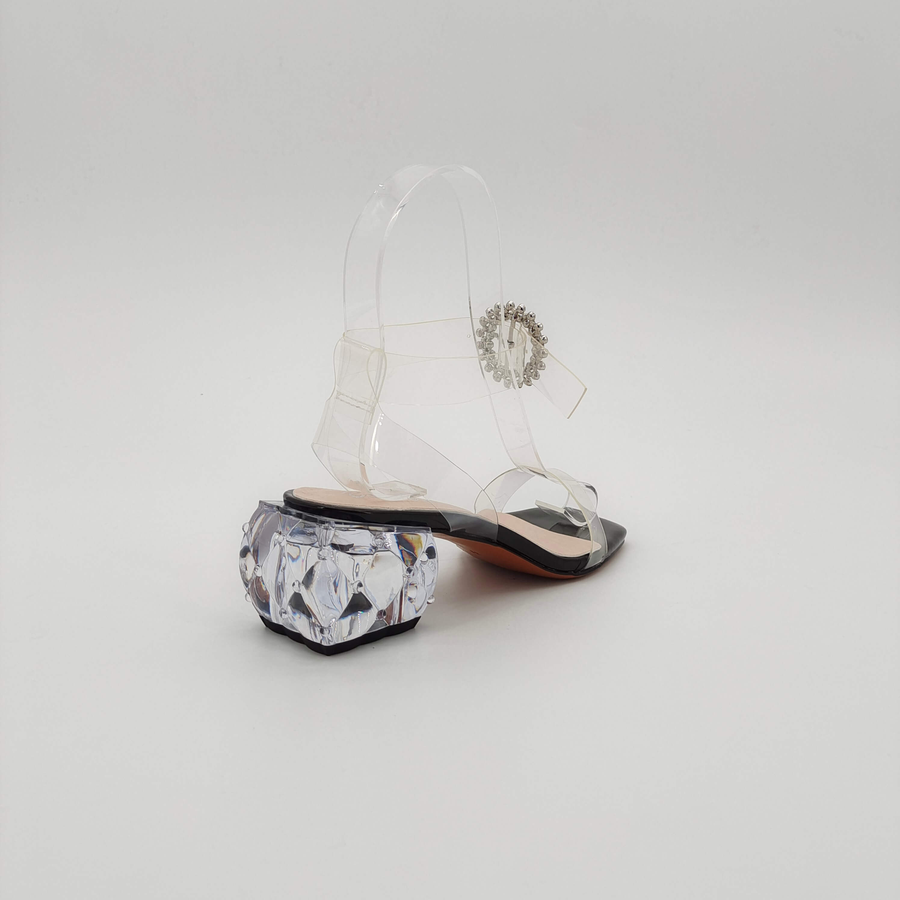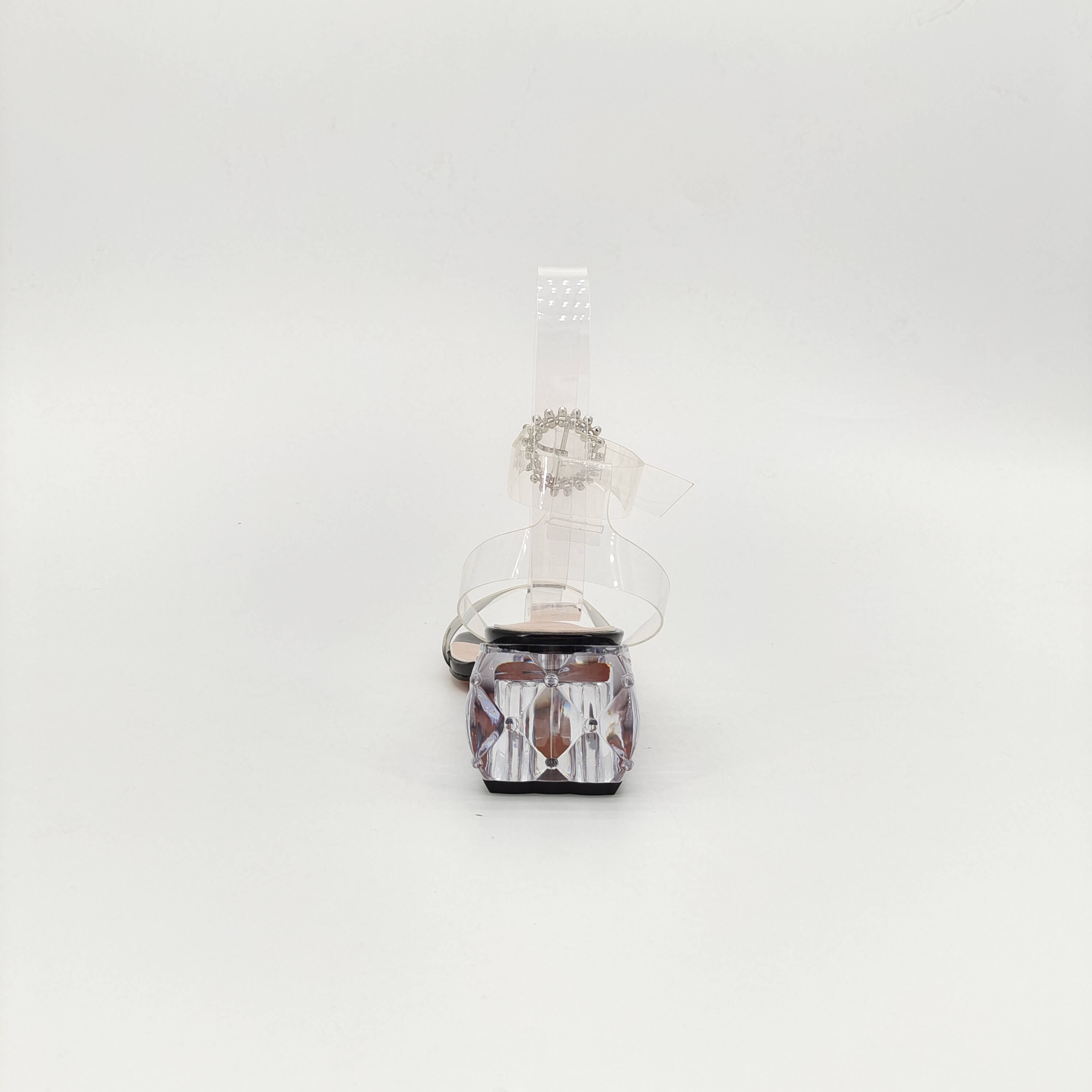 Transparent shoelace high-heeled sandals with silver metal buckle and crystal square decoration, black flat bottom