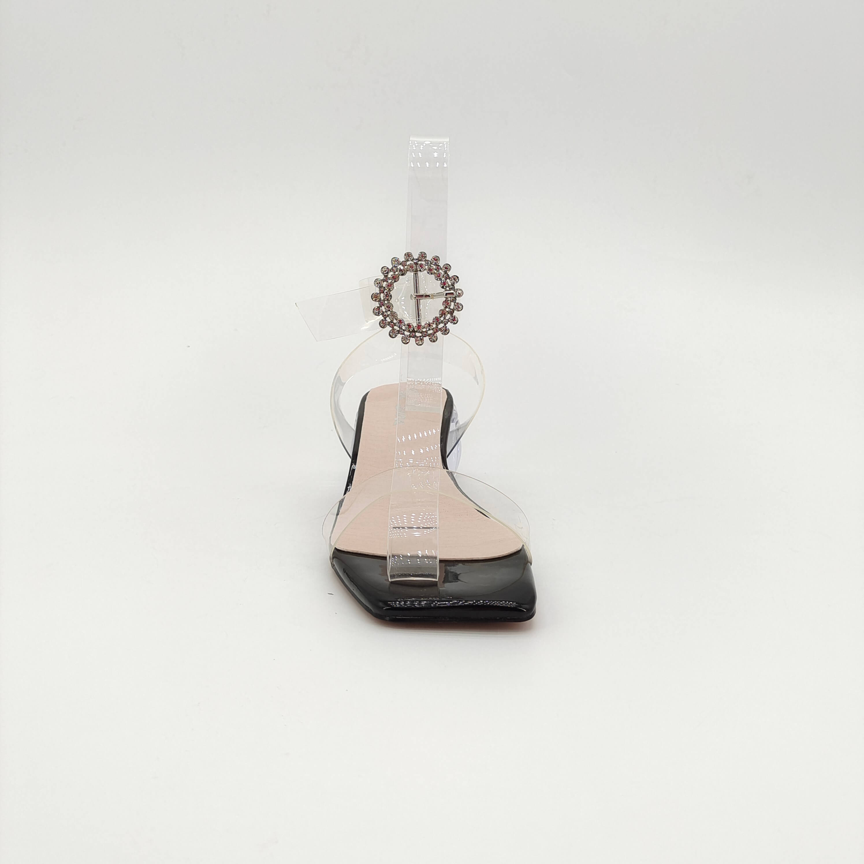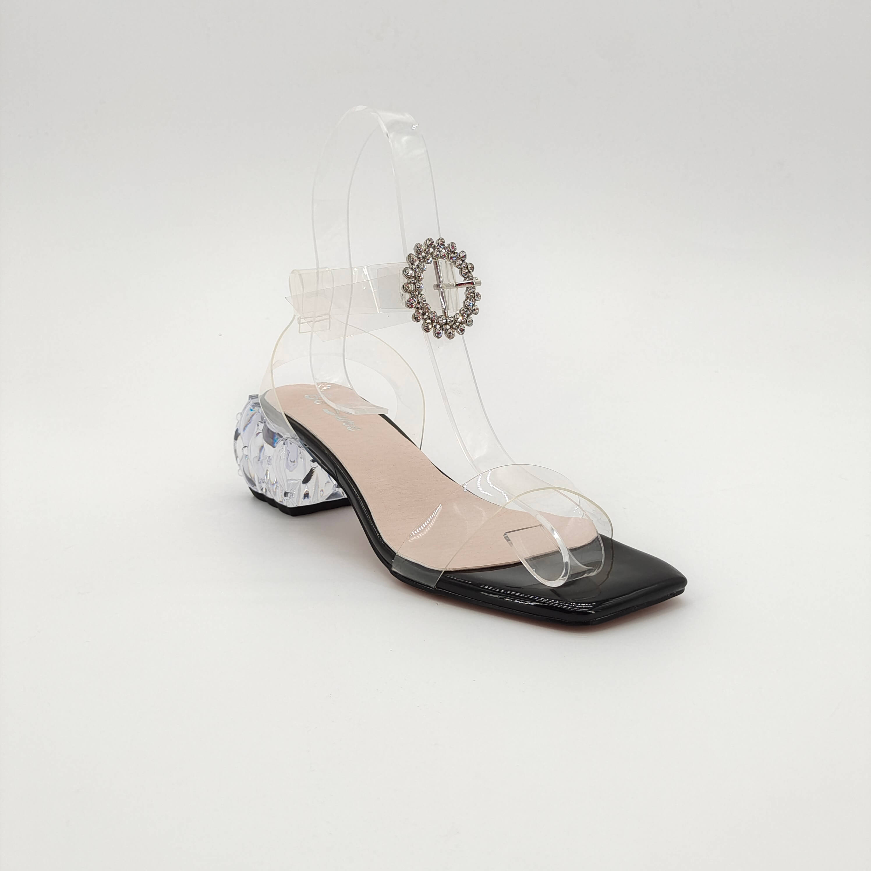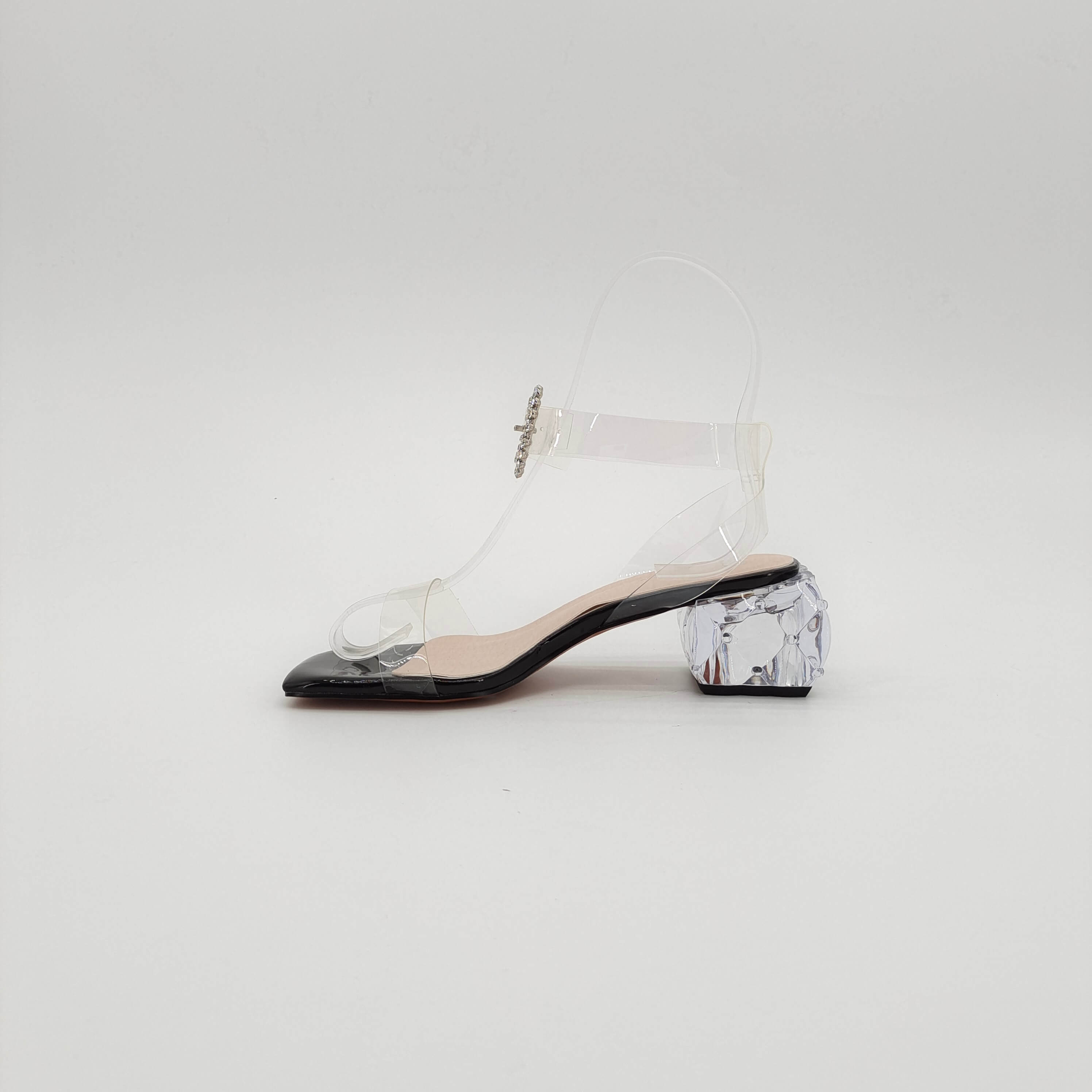 Transparent shoelace high-heeled sandals with silver metal buckle and crystal square decoration, black flat bottom