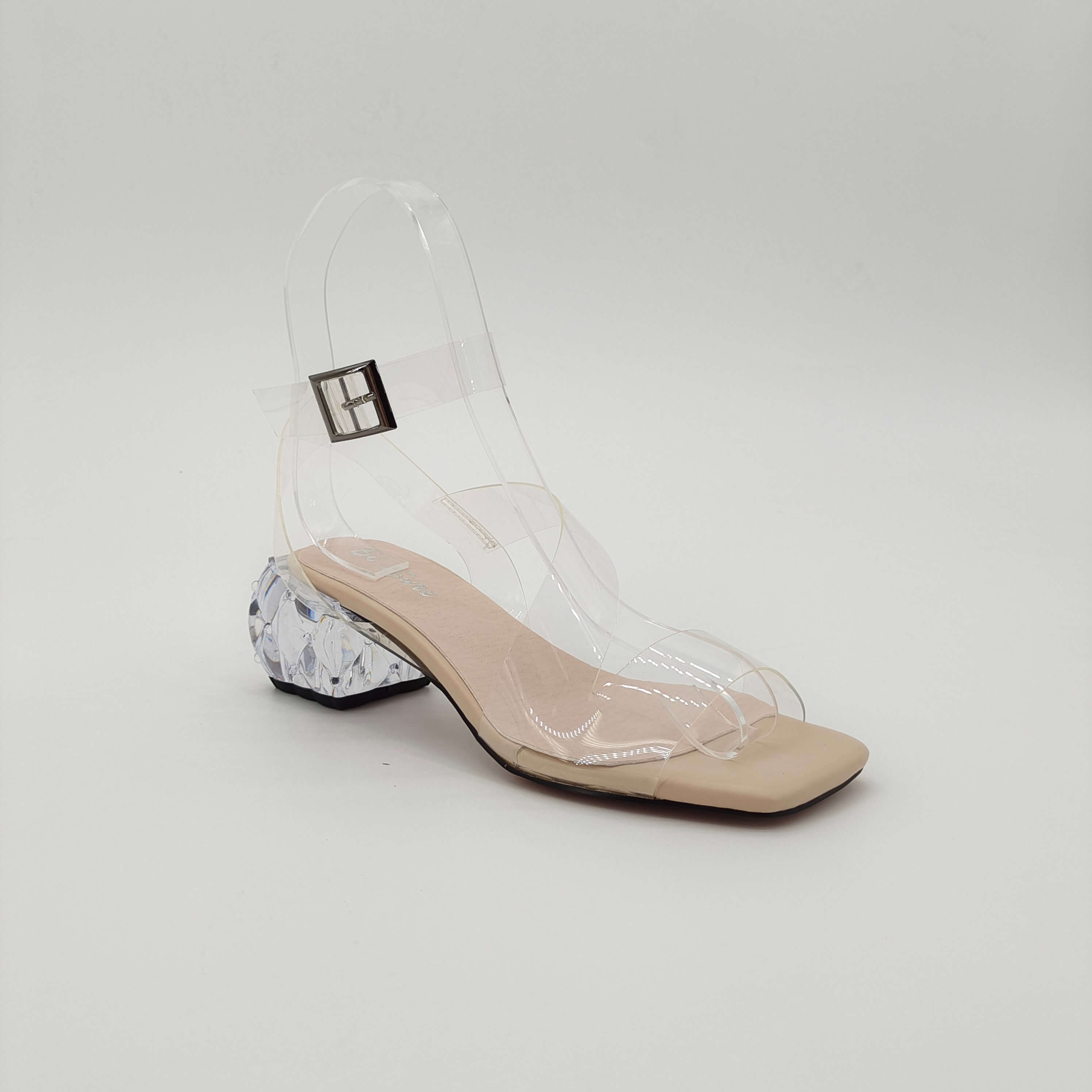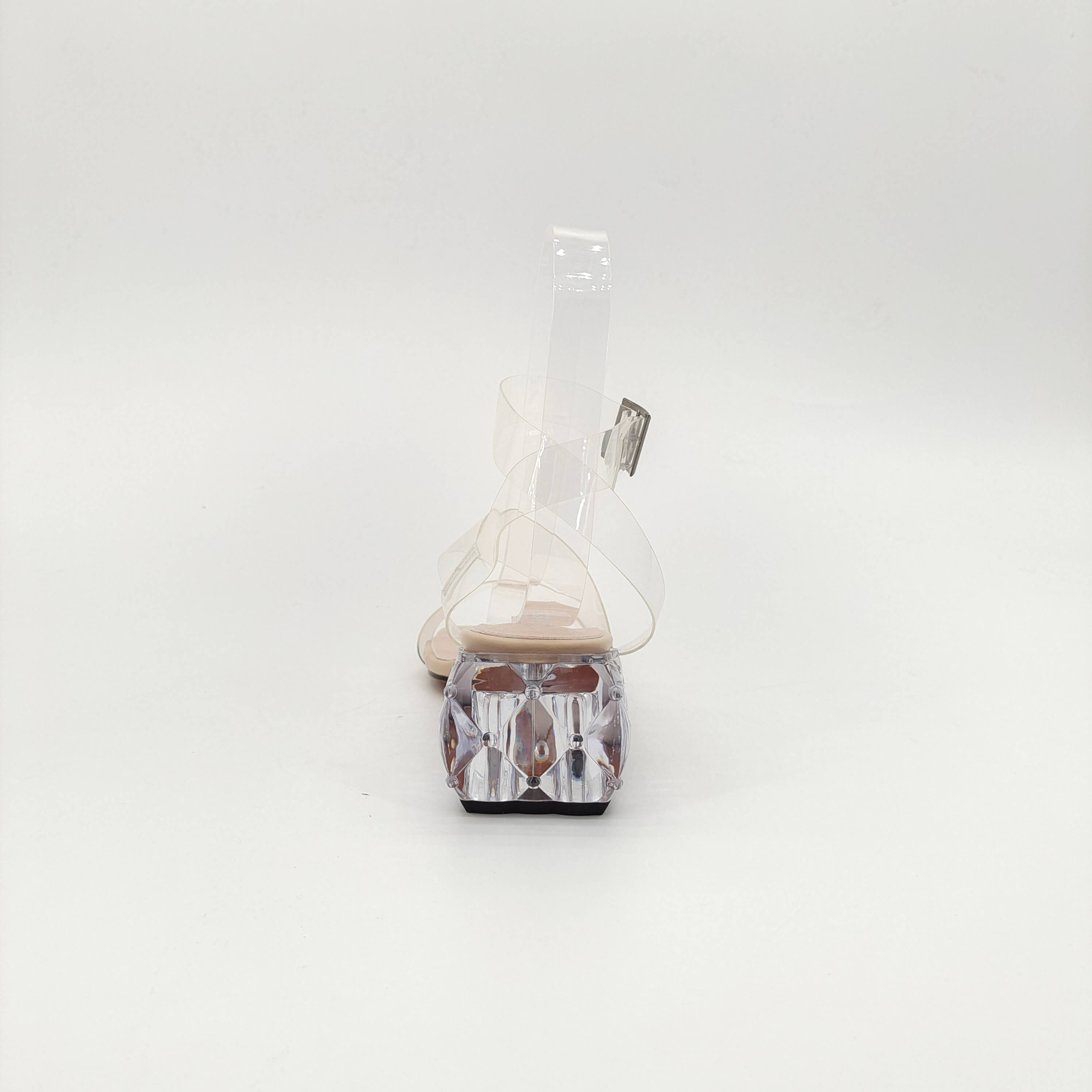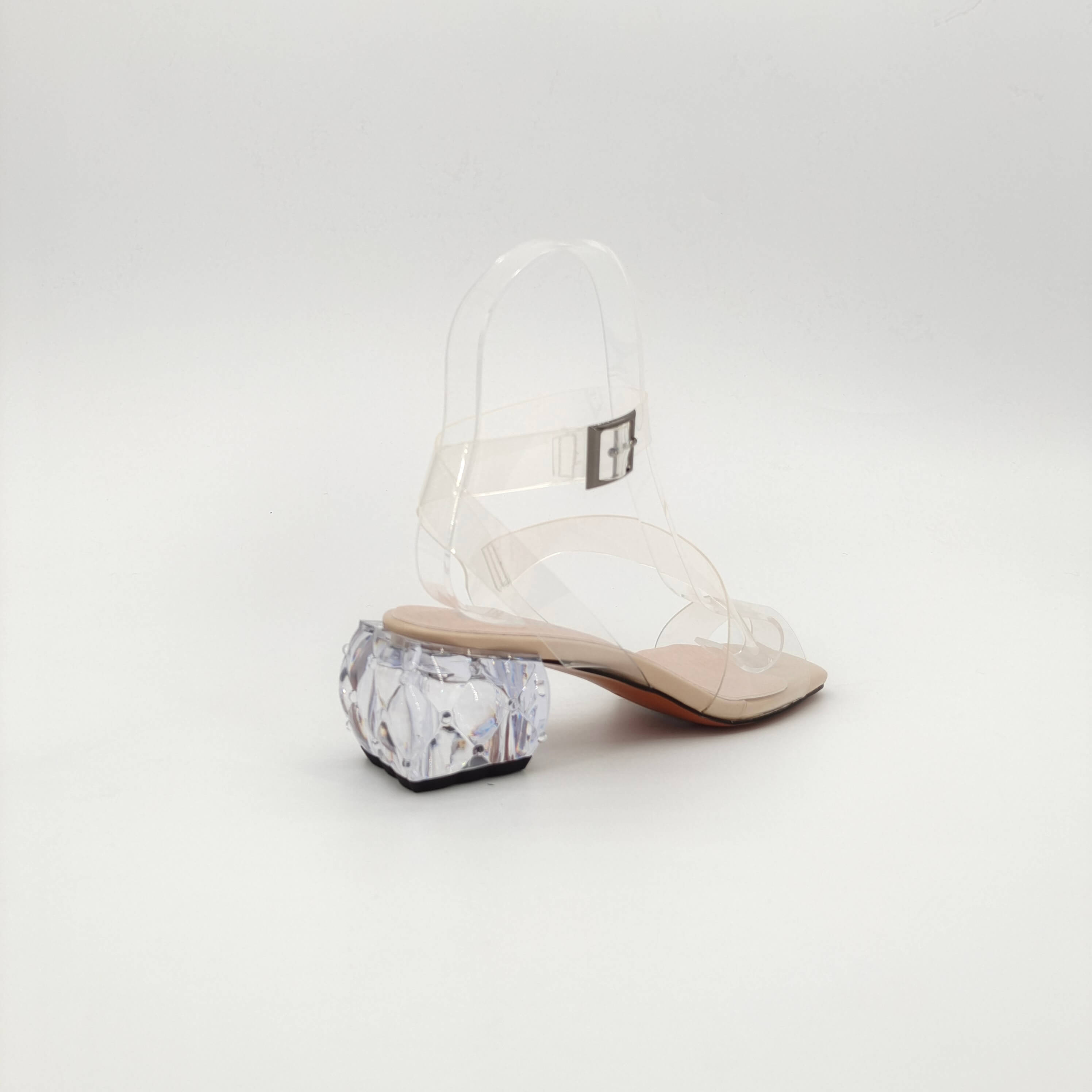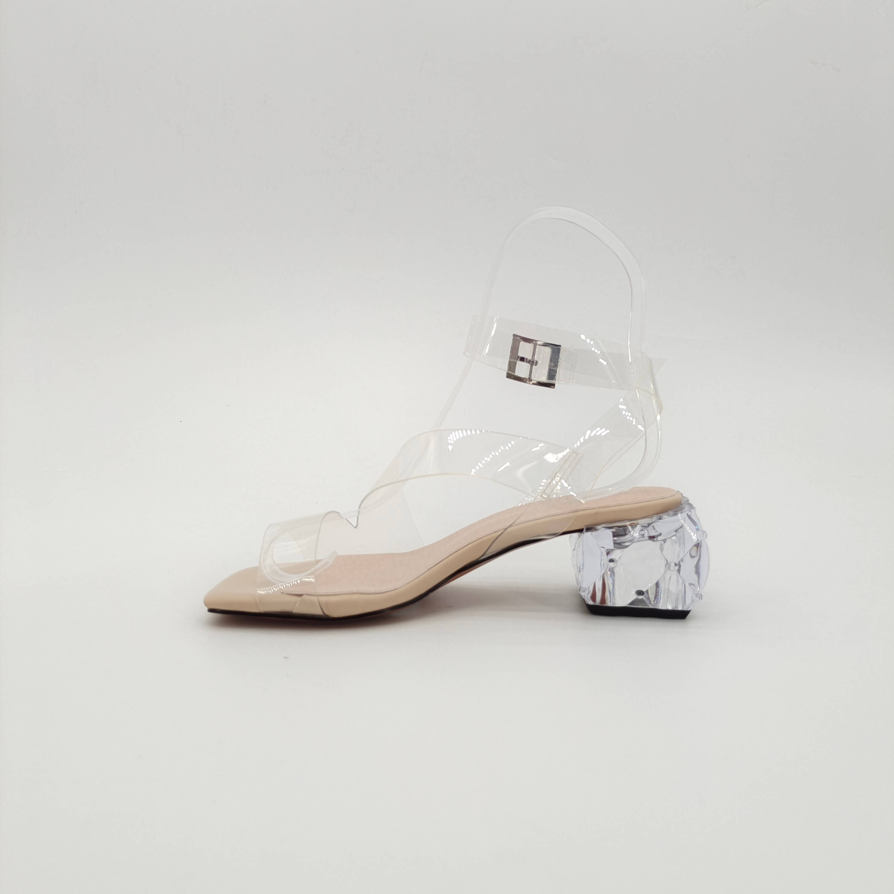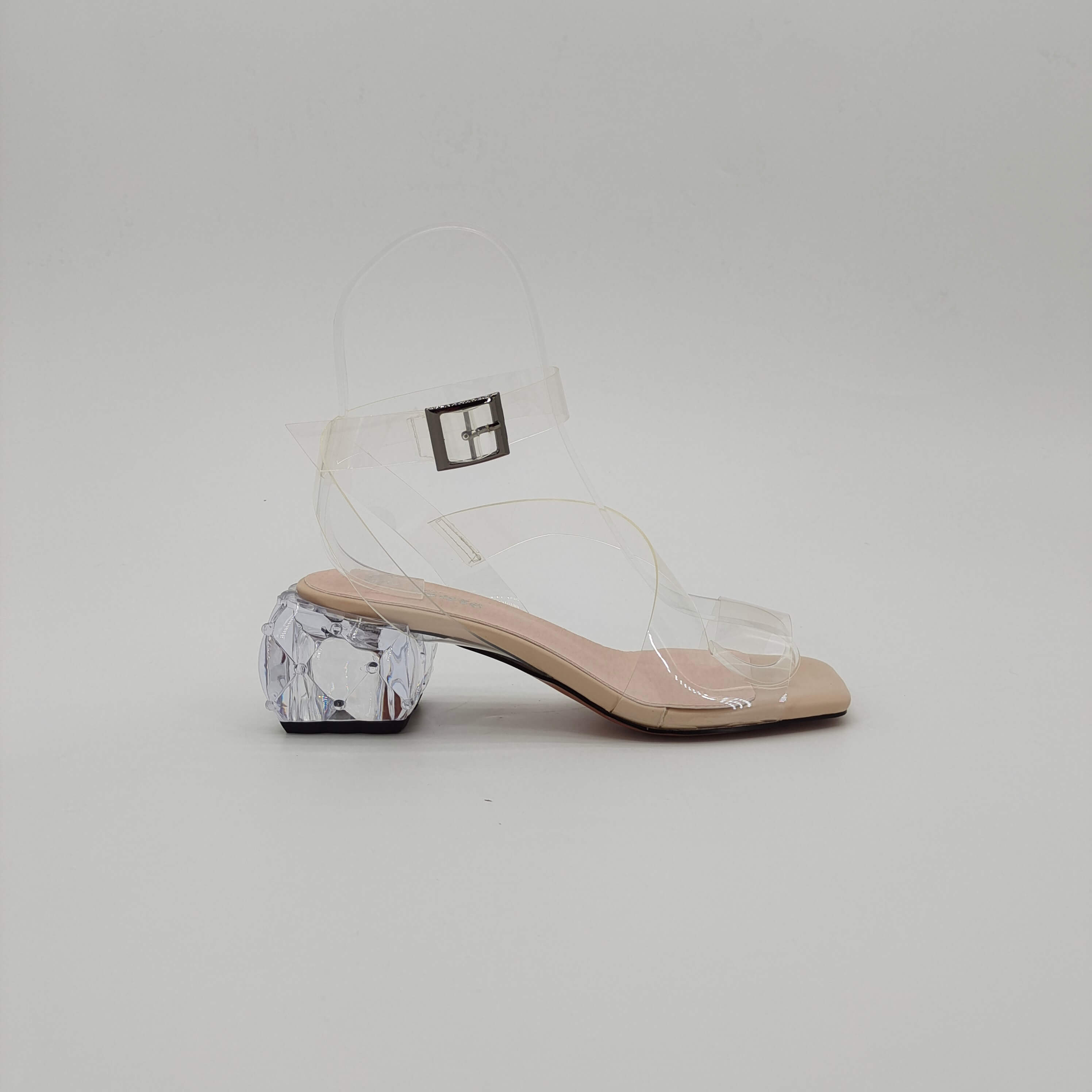 Lightweight transparent shoelace high heels with irregular white marble pattern sole and elegant black metal buckle decoration