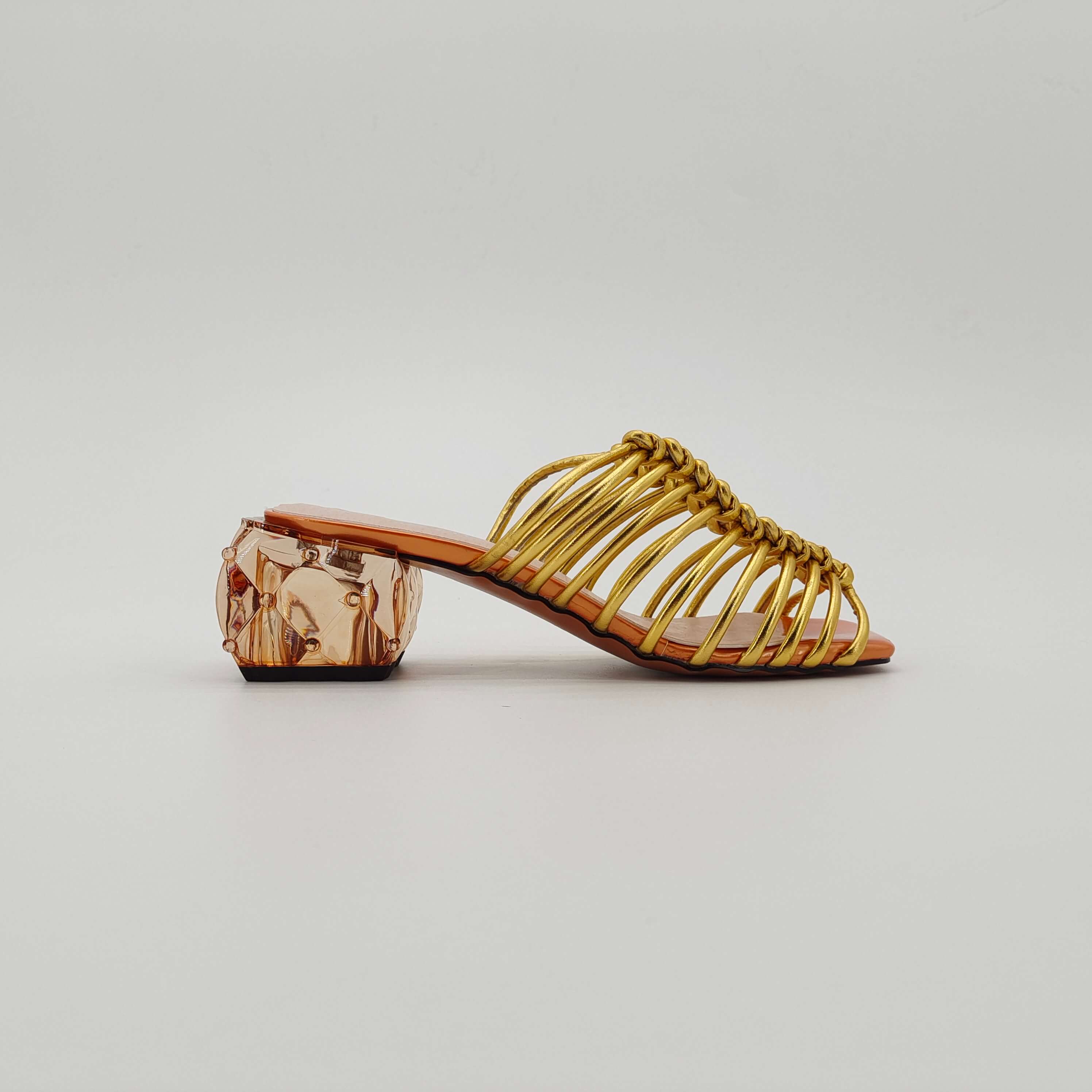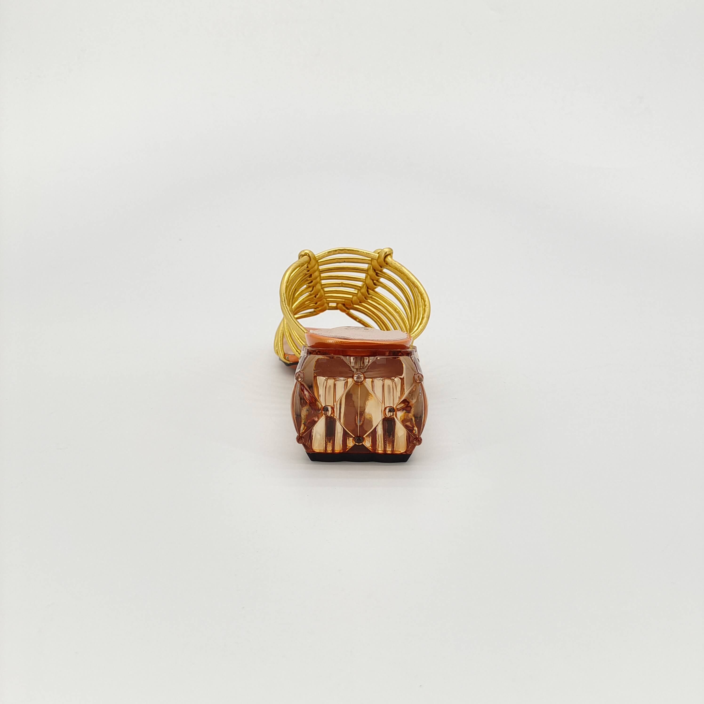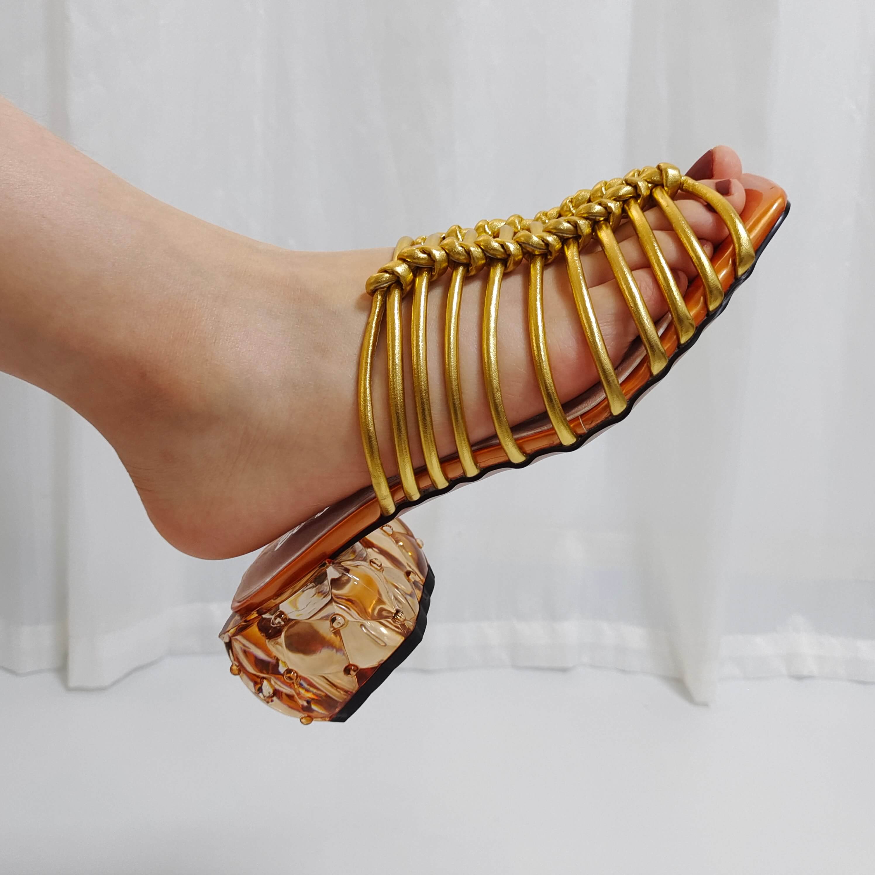 Golden woven high-heeled sandals with transparent heel design, fashionable and comfortable light brown sole women's shoes