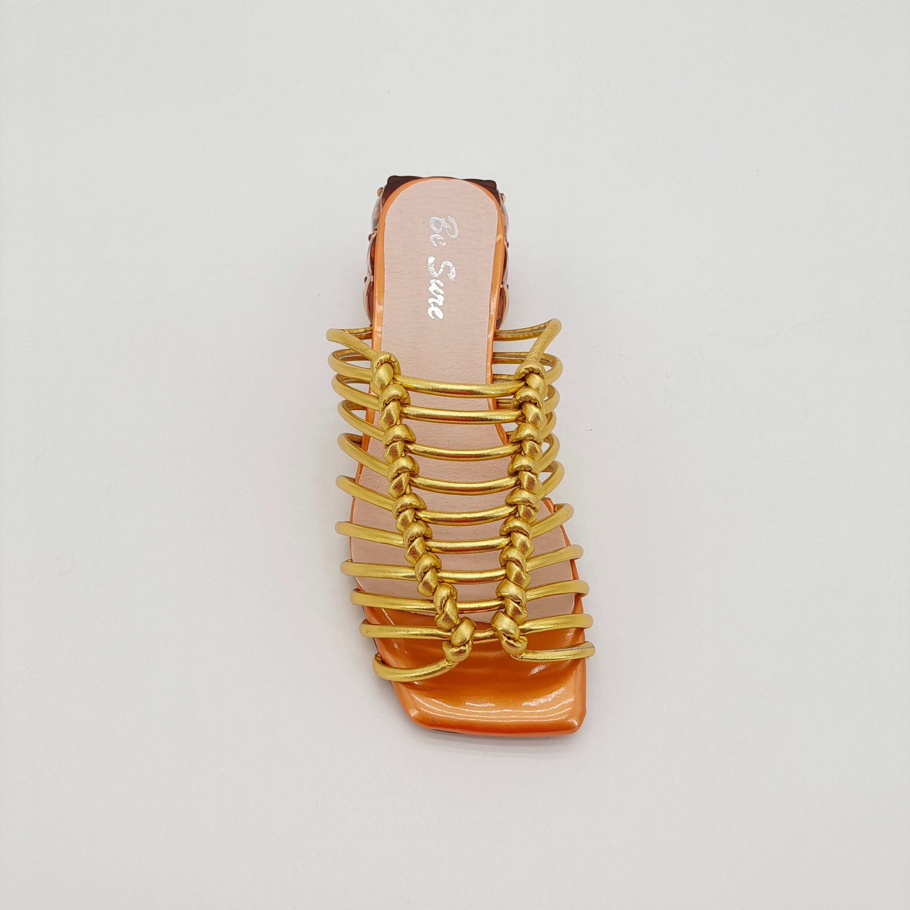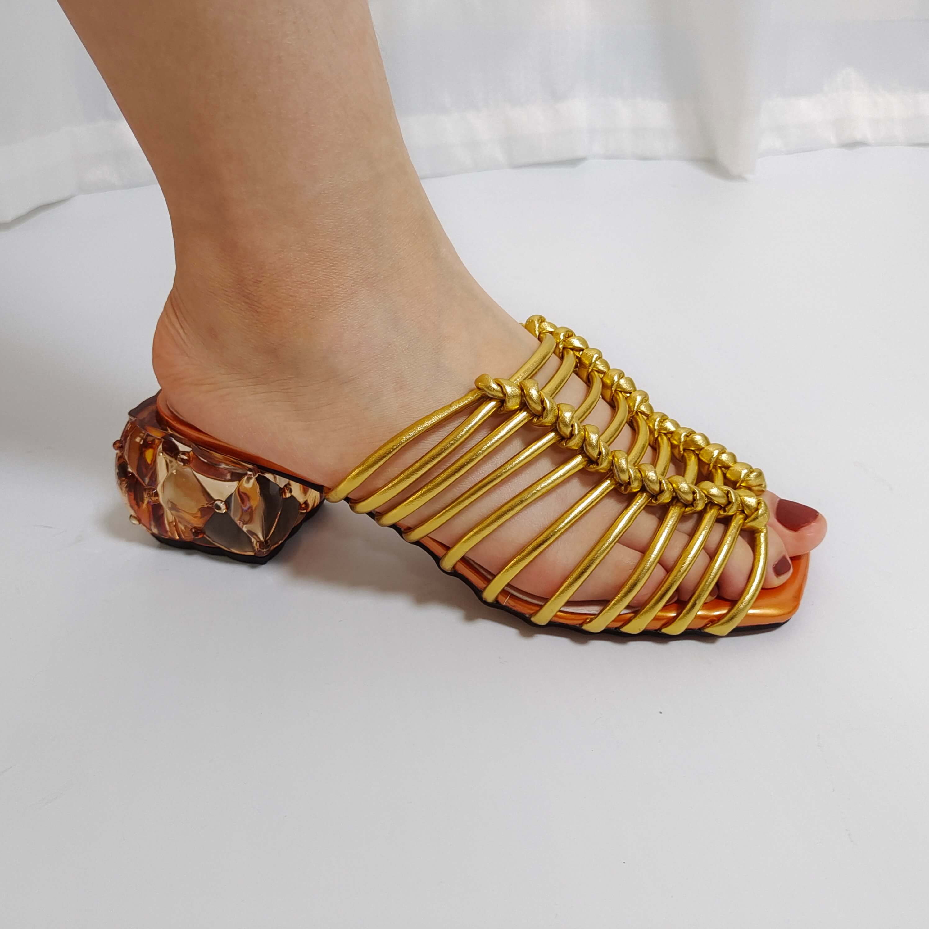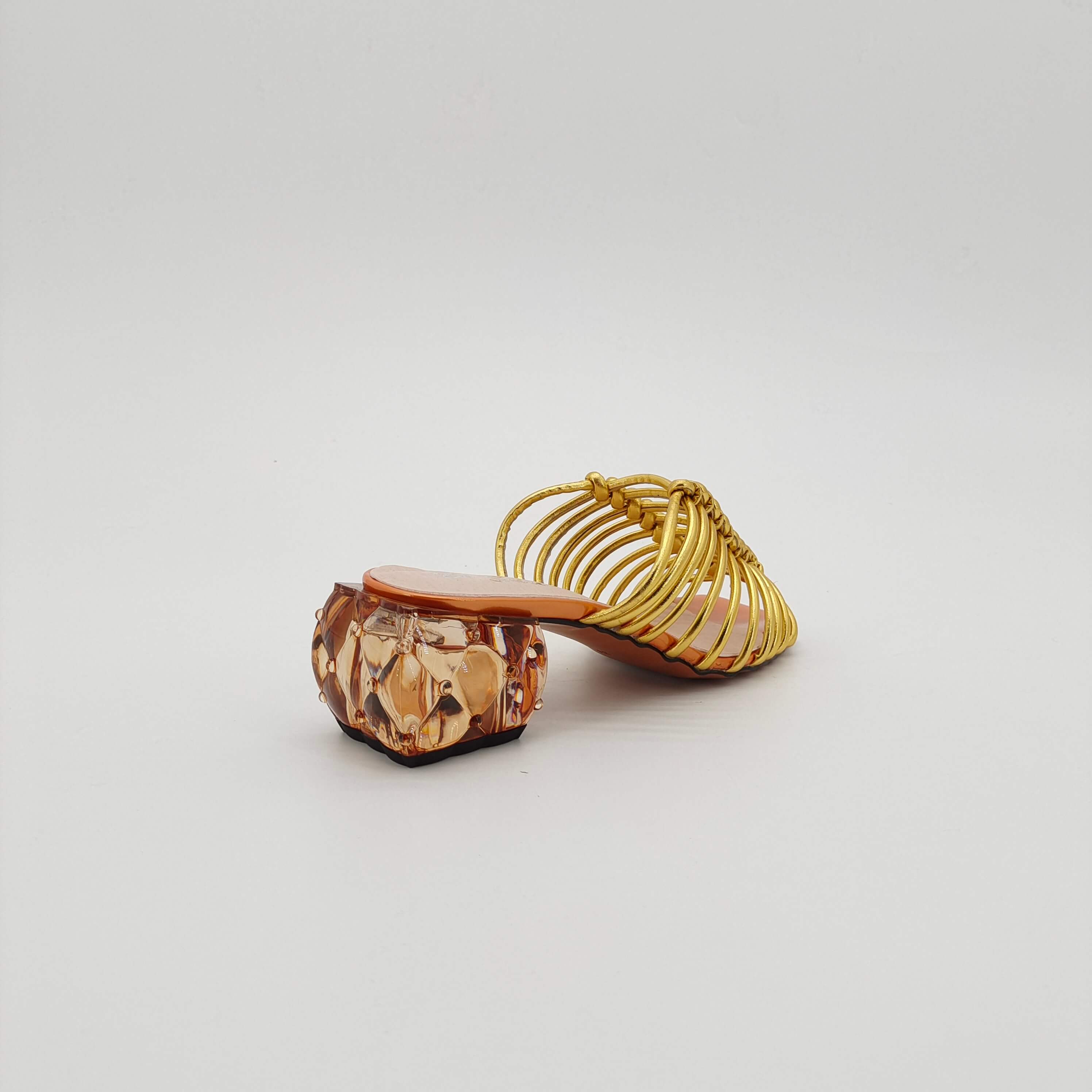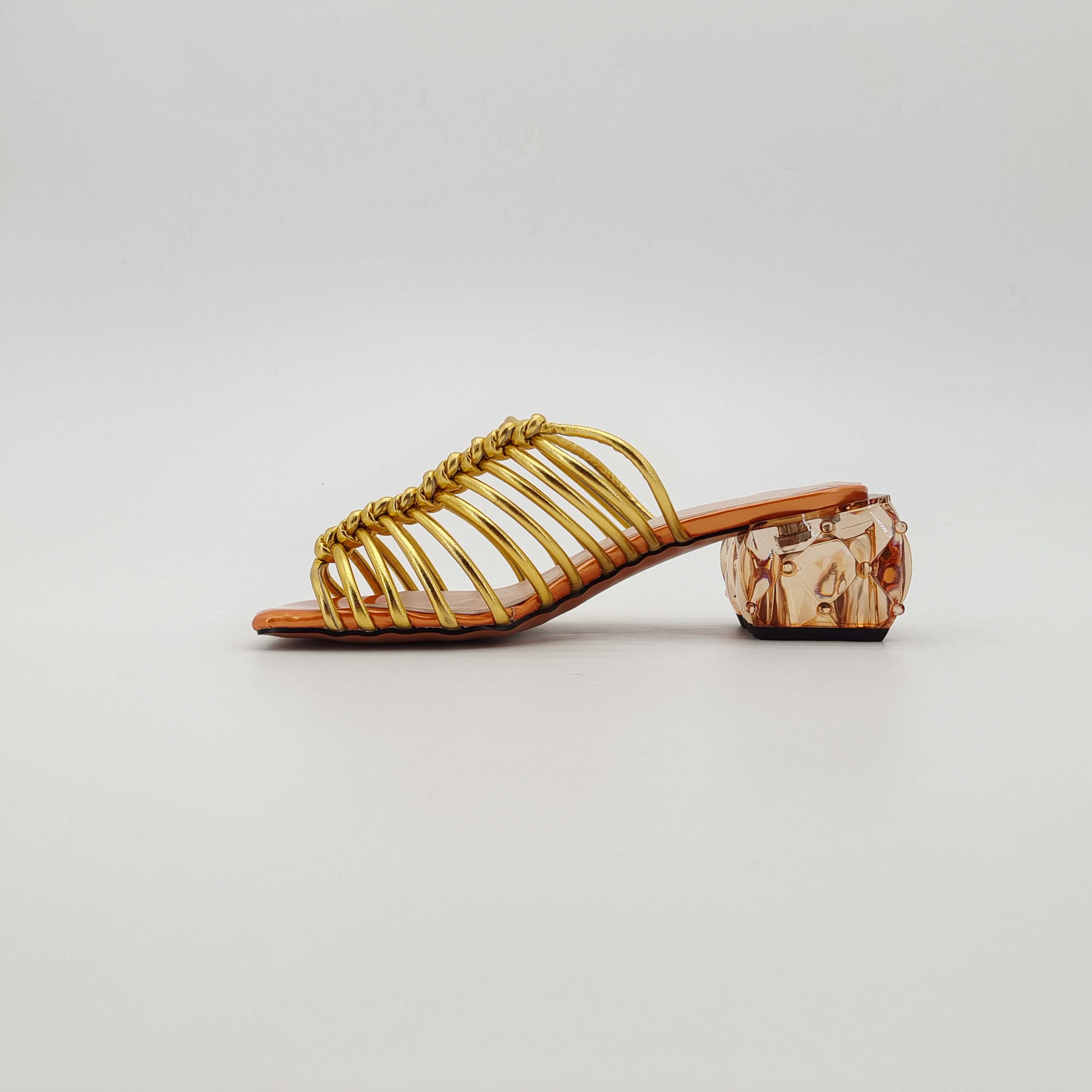 Golden woven high-heeled sandals with transparent heel design, fashionable and comfortable light brown sole women's shoes