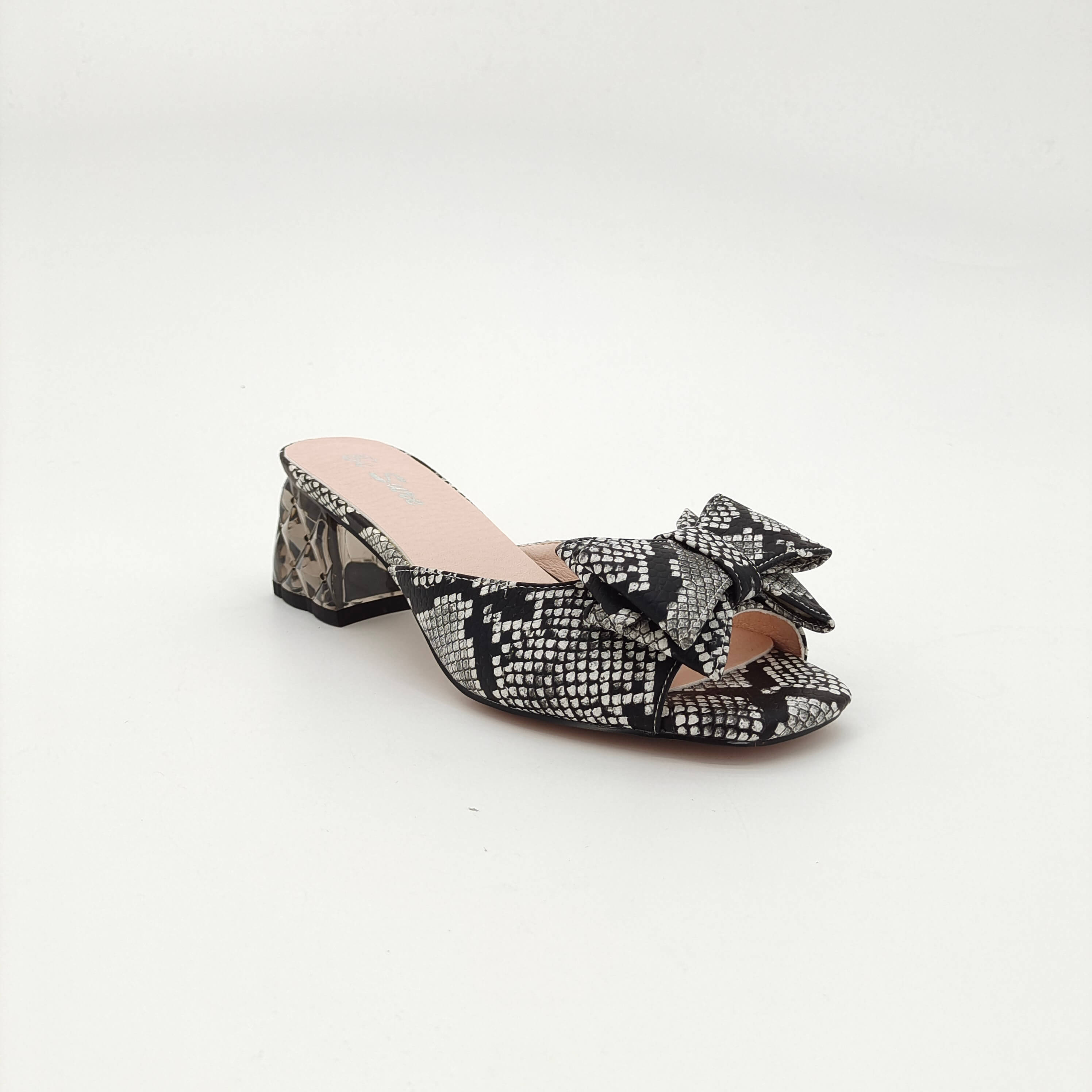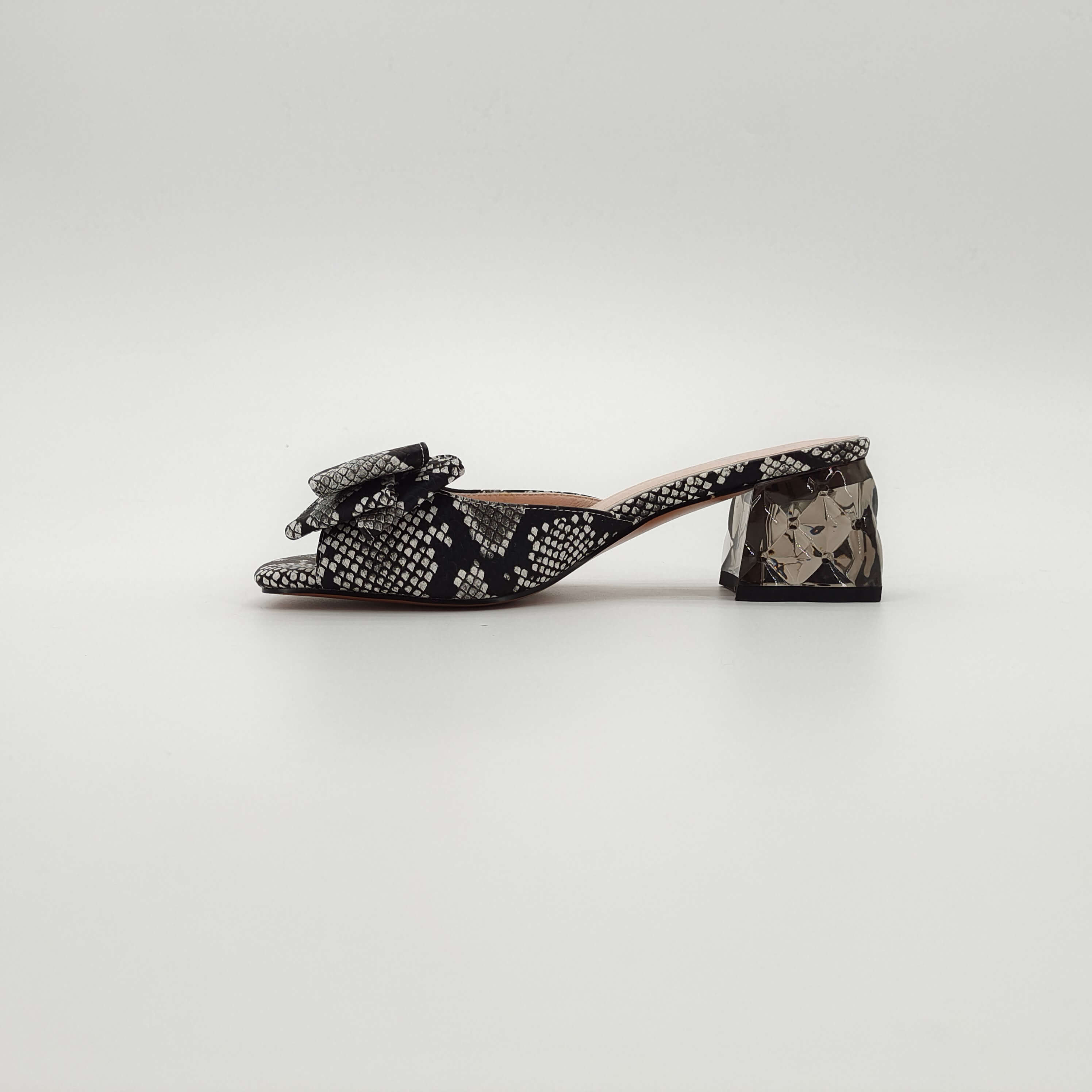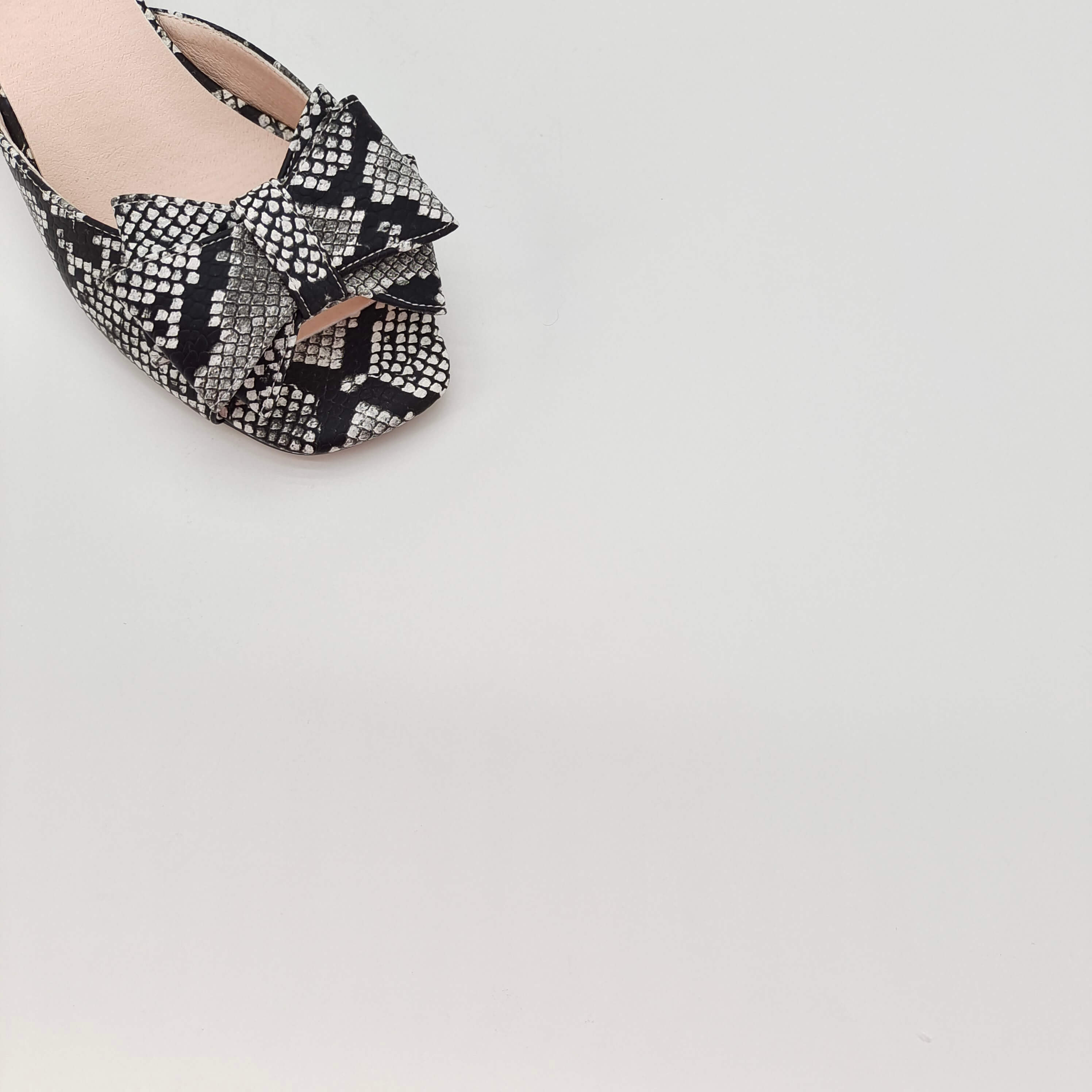 Black and white snake patterned women's sandals with a bow design at the center heel, a classic and versatile choice