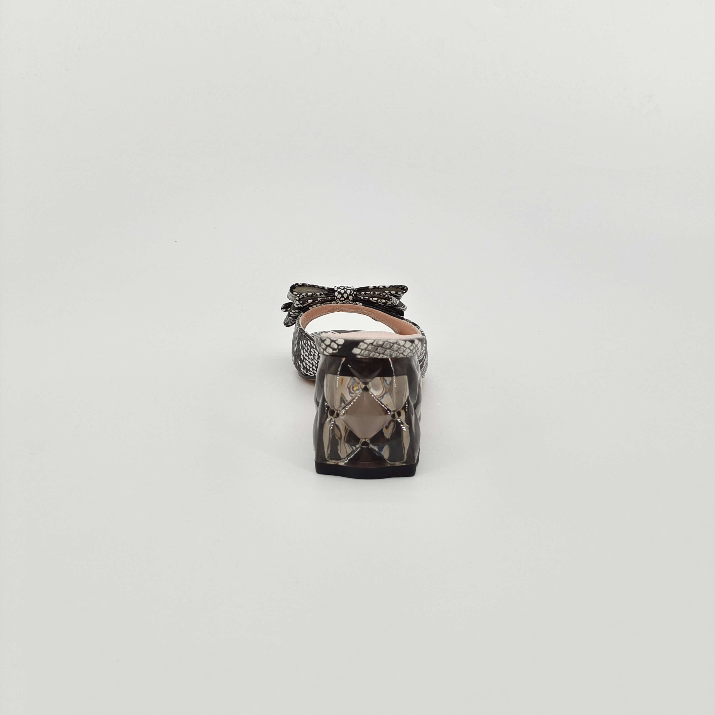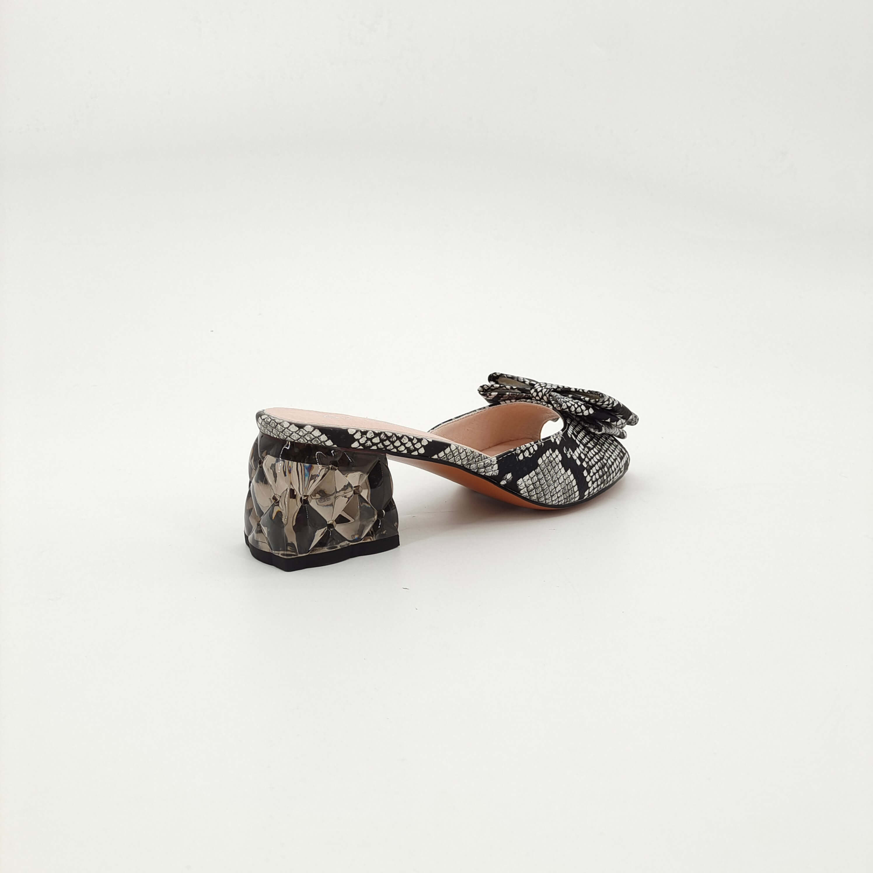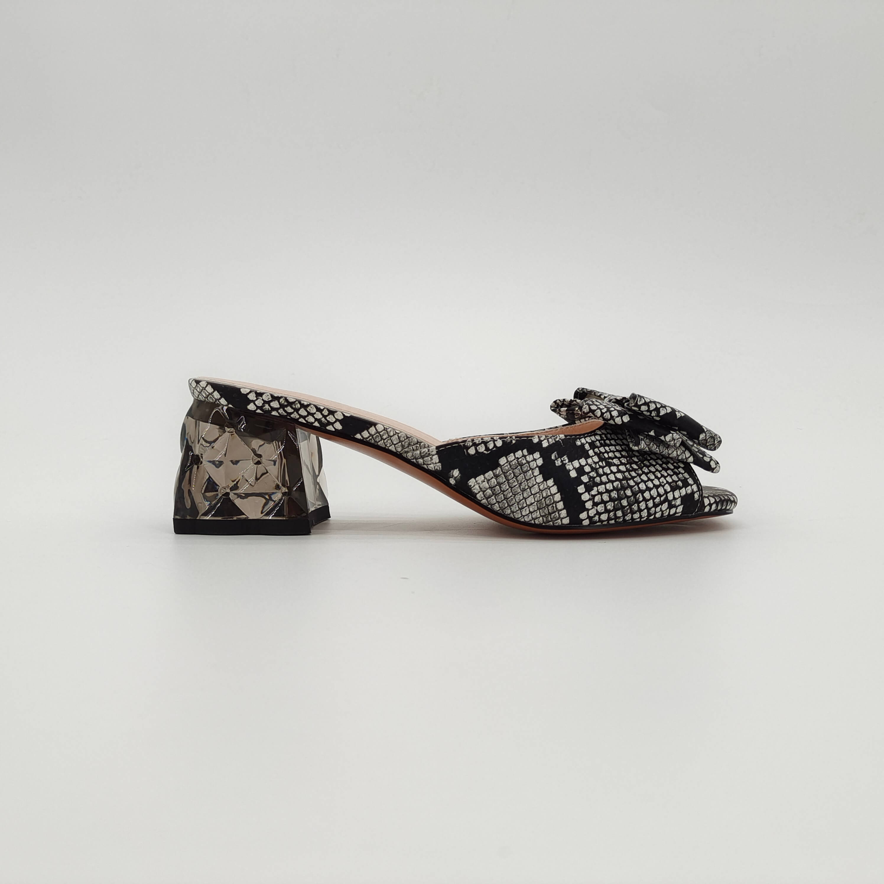 Black and white snake patterned women's sandals with a bow design at the center heel, a classic and versatile choice